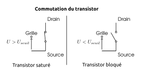 En utilisant des tensions de commandes n’ayant que deux valeurs: 0, ou 5V, il est possible d’utiliser le transistor comme un interrupteur placé entre les bornes et et commandé par la tension .