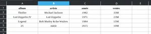 CSV: données séparées par des virgules Coma Separated ValuesJSON: notation objet issue de javascript.{"album":"Thriller","artiste":"Michael Jackson","année":1982,"ventes":"33M"} {"album":"Led Zeppelin IV","artiste":"Led Zeppelin","année":1971,"ventes":"23M"} {"album":"Legend","artiste":"Bob Marley & the Wailers","année":1984,"ventes":"15M"} {"album":"25","artiste":"Adele","année":2015,"ventes":"10M"}XML: format de données avec balises eXtensible Markup Langage<?xml version="1.0" encoding="utf-8"?> <data> <row> <album>Thriller</album> <artiste>Michael Jackson</artiste> <année>1982</année> <ventes>33M</ventes> </row> <row> <album>Led Zeppelin IV</album> <artiste>Led Zeppelin</artiste> <année>1971</année> <ventes>23M</ventes> </row> <row> <album>Legend</album> <artiste>Bob Marley & the Wailers</artiste> <année>1984</année> <ventes>15M</ventes> </row> <row> <album>25</album> <artiste>Adele</artiste> <année>2015</année> <ventes>10M</ventes> </row> </data>